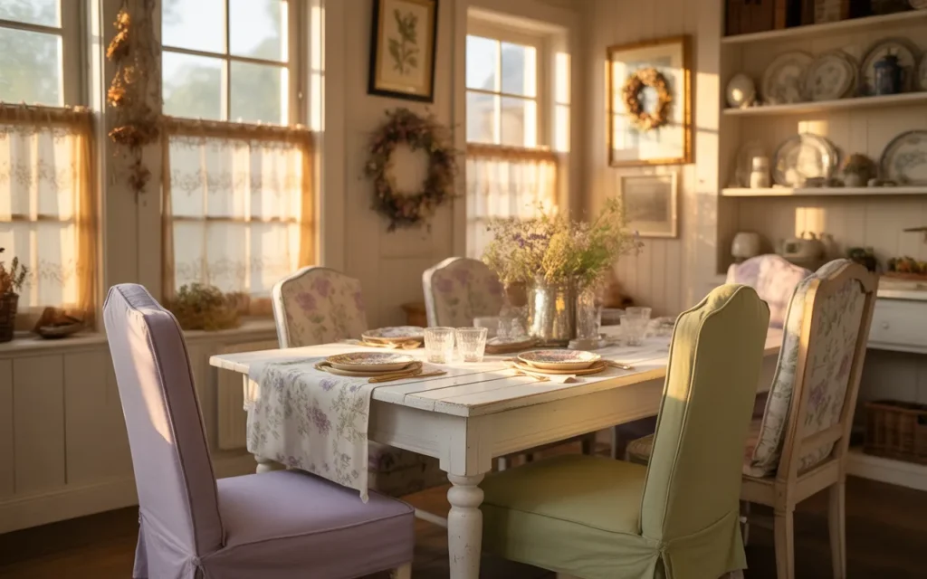 Cottage-style dining rooms are loved for their cozy, welcoming feel. Floral textiles add softness and charm, creating a cheerful and timeless atmosphere. The whitewashed table and vintage-inspired chairs enhance the room’s rustic appeal. Soft pastel tones contribute to the gentle, inviting environment, making it a perfect space for everyday meals and gatherings.